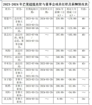 高管共 11 名,2023-2024年度總薪酬合計2468.00 萬元,對比芒果超媒年報,高官人員工資占比偏高。