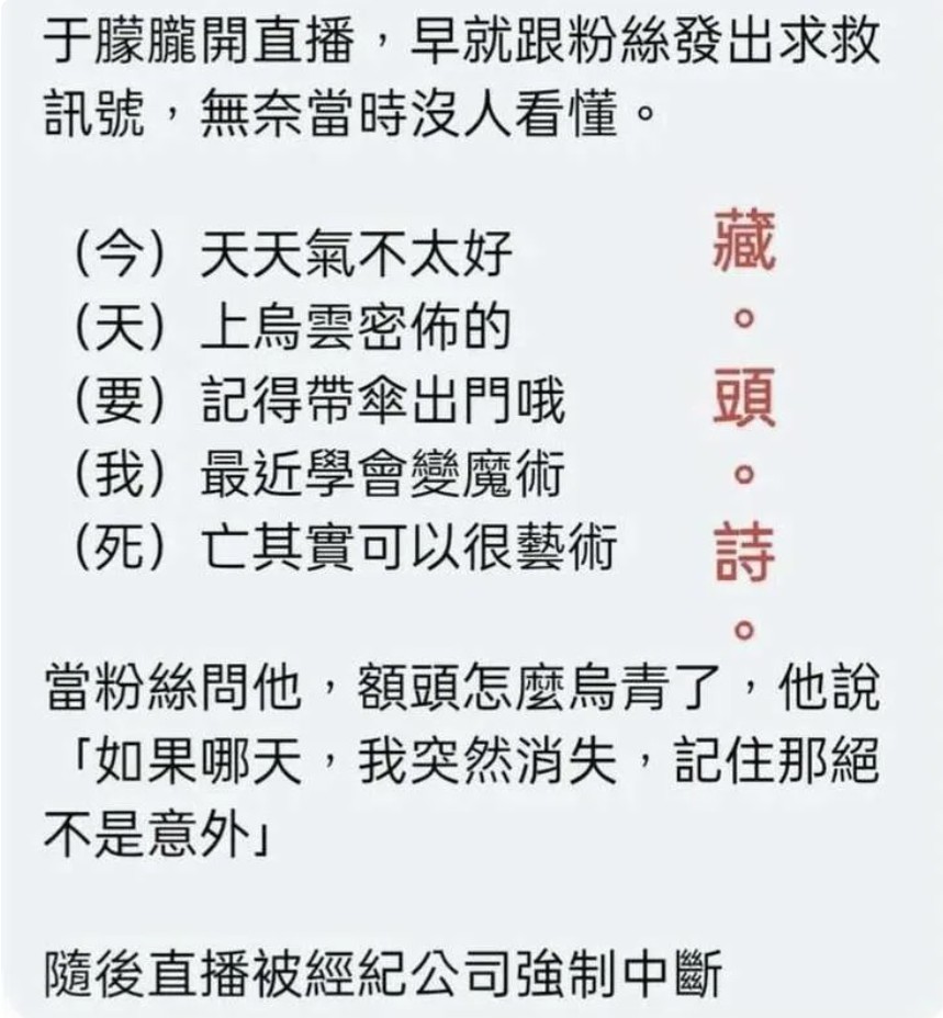 于朦胧在直播中说出“今天天气不太好,要记得带伞。我最近学会变魔术,死亡也可以很艺术”,每句句首文字连成“今天要我死”的藏头句 (翻摄自抖音)