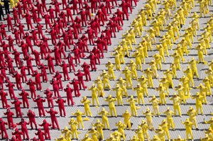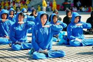 2025年10月18日,来自台湾、美加日韩、香港等地的部分法轮功学员逾五千人,在台北中正纪念堂自由广场,排出巨型的“法轮图形及‘法轮常转’”图像。图为法轮功学员大炼功活动。(宋碧龙/大纪元)