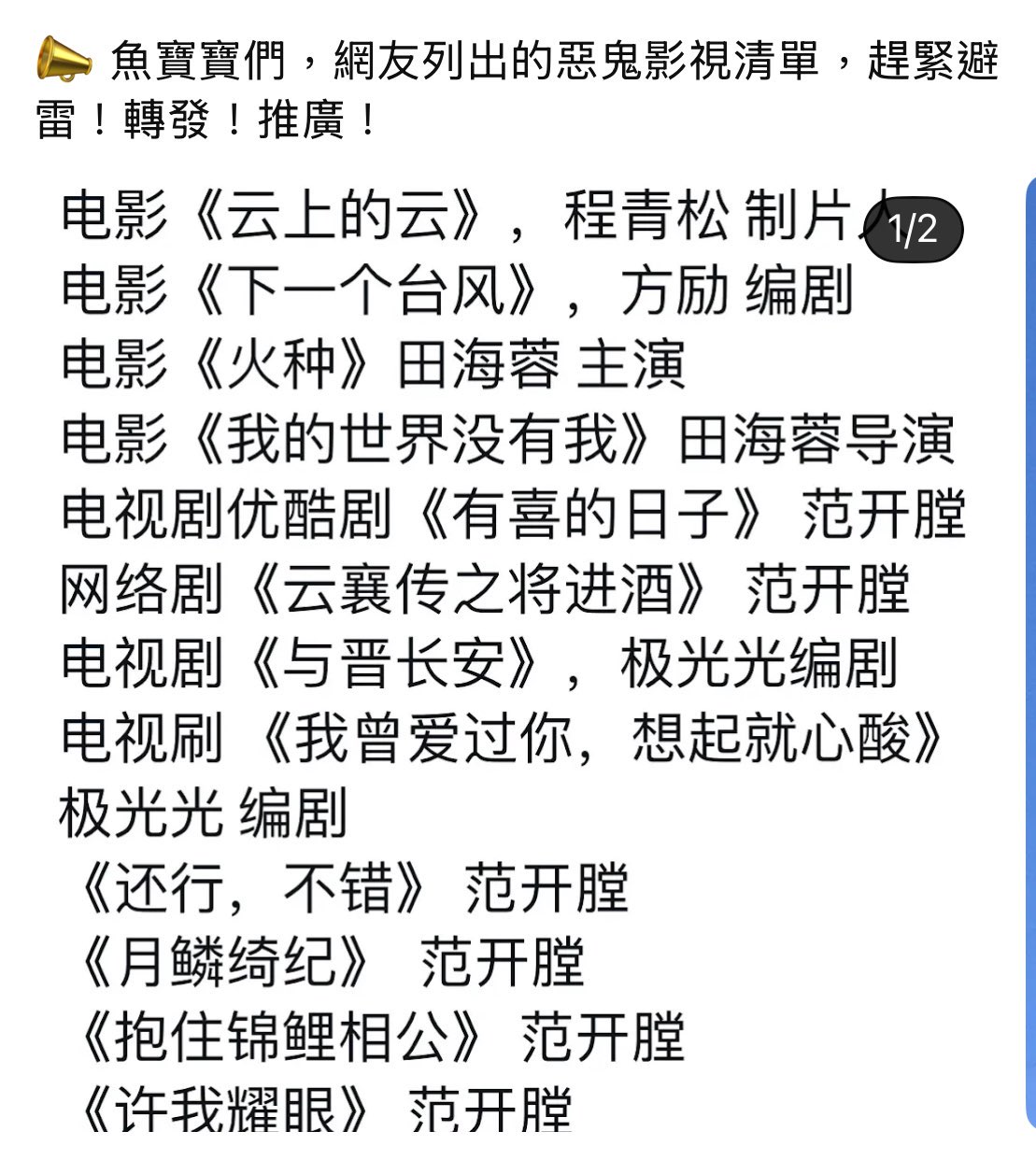 有粉丝列出了涉及于朦胧案的艺人的影视清单,并号召抵制。(网络图片)