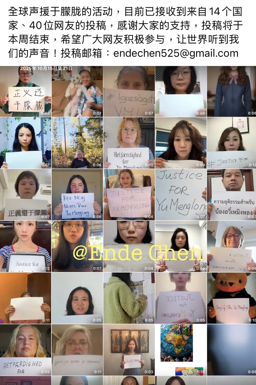 由海外中国民主党举办的全球声援于朦胧的行动,“让世界听到我们的声音”,目前收到14个国家,来自40位网友的投稿。