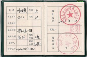 撫順市殘疾人聯合會在2004年8月簽發給葉旭霞的「肢體二級殘疾」證書內頁。(圖片由葉旭霞女兒提供)