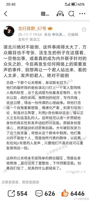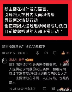 他说,一旦凛北川出事,或者成为内外联手针对的众矢之的,今后再发生任何网络上需要发声的事件,别想再让一个军人站出来。 凛北川和北行其野都是军人。北行其野披露,中共水军采用海内外联动的铺天盖地的公关手段,最终的目的是给凛北川打上一个,为他量身定做的军人型网络人格的标签。按照凛北川的经历,写作风格,说话习惯,将他打造成一个自我重要感强,情绪化严重,刻意引导舆论,制造对立阵营,利用军人身分煽动谣言,借以正义之名制造混乱的人。 北行其野表示,这样就可以进一步质疑凛北川身分的真实性和发声动机的可信度。凛北川的微博大号被扣就是为了这个做准备,将他从这个群体中割席。以后再有任何军人背景的人发声,只要他们不喜欢就可以重复使用这一招。 北行其野认为,这样的公关手段根本不是简单的舆论碾压,而是在拿凛北川祭旗,是在往死里整他,下作阴狠至极。 有网友问,海外水军鹅主播是怎么回事? 凛北川10月28号曾发帖说,鹅主播是帮对面(警方)制造并引导内网传播谣言,为给嫌疑人提供起诉网暴的洗白条件,和给内网持续下发蓝底/净网计划机会的领头人之一,主要活动在外网,人在内陆,也是内陆人。