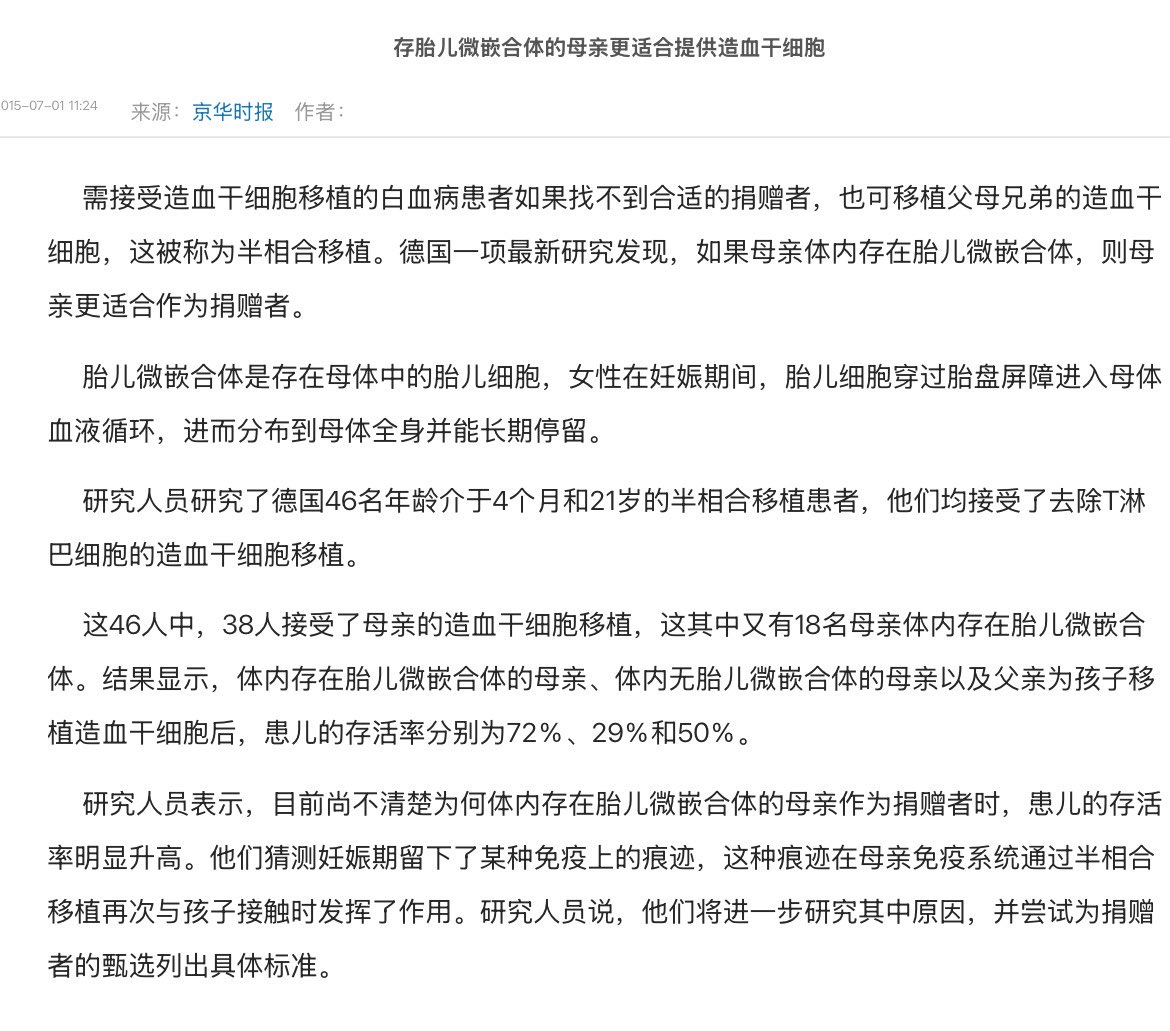 大陸媒體京華時報早在2015年7月1日就報道過關於「胎兒微嵌合體的母親更適合提供造血幹細胞」。
