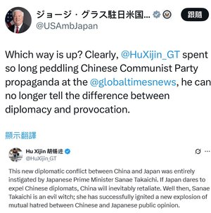 對此,美國駐日大使葛拉斯也「參戰」,在X貼出了胡錫進文章截圖,他並諷刺:「顯然胡錫進在《環球時報》長時間幫中共宣傳,以至於他已經分不清楚外交和挑釁的區別了。」