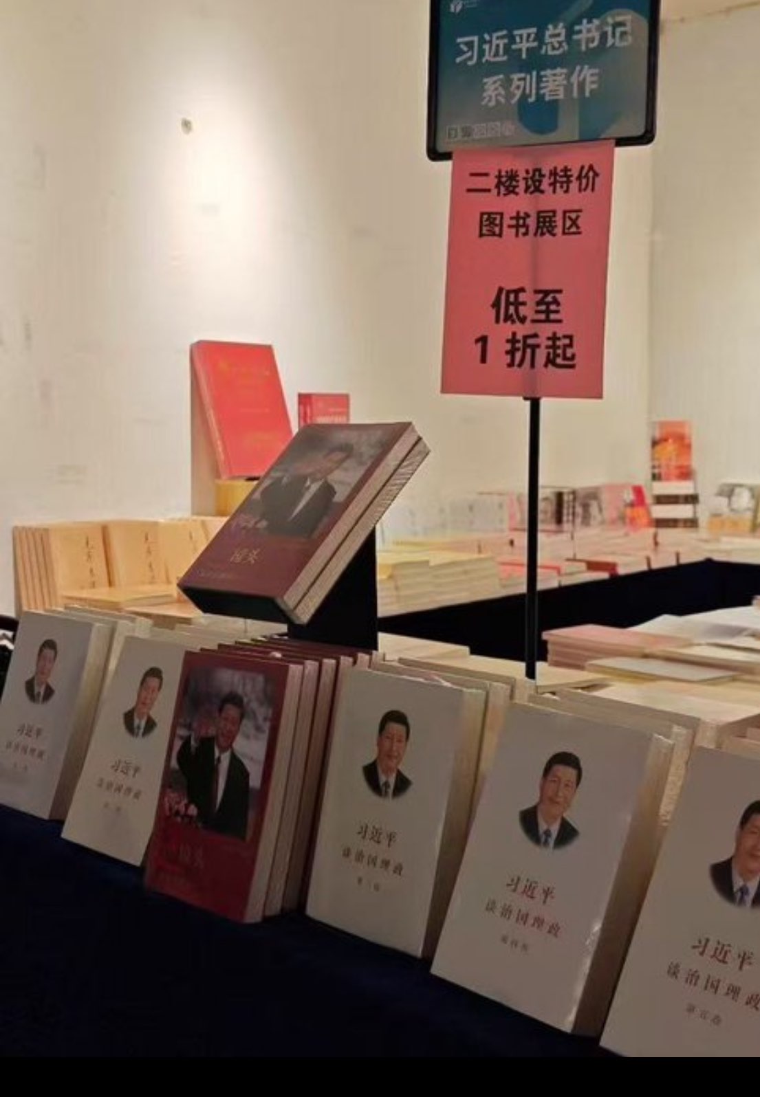 【人民报消息】在当下中国各大书店的显眼位置,总能看到一排排以习近平名义出版的书籍,封面金光闪闪,定价不菲,却常常落满灰尘。照片中,那堆积如山的《习近平谈治国理政》系列、《习近平著作选读》,甚至打出“低至1折”的促销牌子,依旧无人问津。