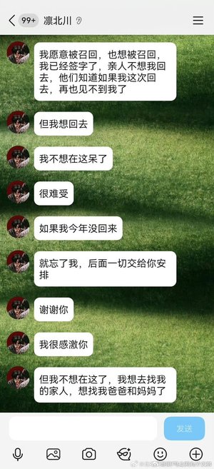 我们来看看凛北川是怎么说的:“我愿意被召回,也想被召回,我已经签字了,亲人不想我回去,他们知道如果我这次回去,再也见不到我了。但我想回去,我不想在这呆了,很难受。如果我今年没回来,就忘了我,后面一切交给你安排。谢谢你。但我不想在这了,我想去找我的家人,想找我爸爸和妈妈了。”