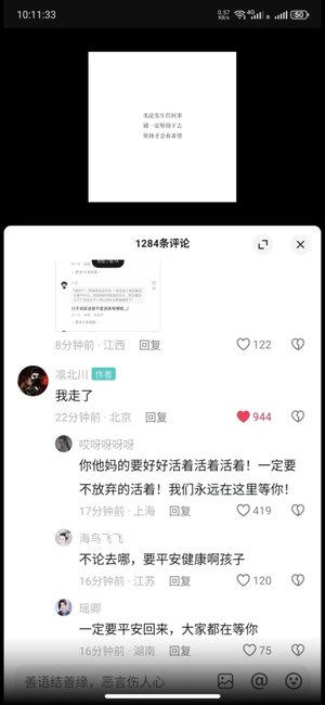 11月22号,大陆B站传出抖音号“凛北川”发出的留言截图。其中一再出现“再见”“我走了”“回不去(家)了”等词句,但要求其他网友继续坚持(为于朦胧讨公道)。这段视频很快就被删除,有网友及时录制了下来。目前,凛北川所有微博账号全部被清除。