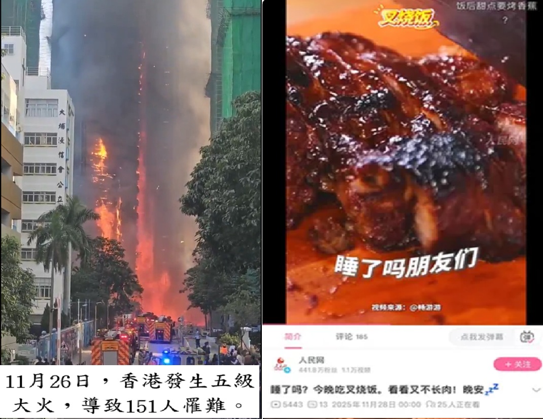 【人民报消息】香港大埔宏福苑11月26日发生五级大火,至少128人遇难,逾200人失踪,是香港77年来最严重火灾,全球民众莫不感到震惊与哀悼。然而,中共官媒《人民网》竟在28日凌晨,在网路上发布影片“今晚吃叉烧”,还有一批小粉红在评论区跟帖叫嚣“香啊”,听起来就如同于朦胧去世后,嫌凶之一的导演程青松发帖称“好吃”一样。难道在中共眼里,中国民众的死亡都被它看做是献祭?