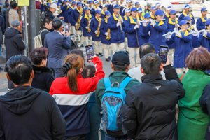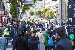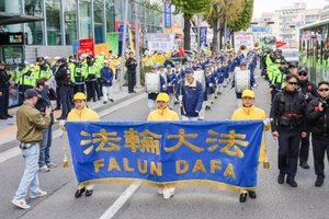 11月2日,韓國首爾中國人聚居地舉行遊行活動,慶祝超過4.5億中國人退出中共黨、團、隊組織,圖為打頭陣的天國樂團在首爾警方協助下出發。(金國煥/大紀元)
