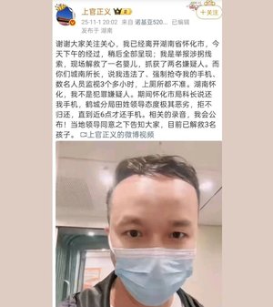 【人民報消息】(人民報記者金欣報導)「過去土匪在深山,如今土匪在公安」是中共執政的一大特色,意思就是指社會上很多的犯罪行為、犯罪集團背後的保護傘,就是當地的公安系統。中國的監控攝像頭掛滿了大街小巷,攝像頭的密度是世界之首,但是如果有失踪大學生、或孩子被人販子拐走,家屬到派出所報警,十有八九都會被拒絕。甚至那些見義勇為出手抓住人販子的俠義之士,還會被派出所當作嫌疑人囚禁。 四川公民上官正義,經常以一己之力追查代孕、拐賣人口,11月1日他在湖南省懷化市舉報有人買賣嬰兒後,竟被警方倒扣了一個「違法」的罪名,被禁錮在派出所,差一點就人間消失。消息令中國網友炸鍋,呼籲追查當地公安是否與拐賣犯罪組織互相勾結。 11月1日中午,上官正義在個人微博帳號發文指出,懷化當地的袁姓女子,透過小紅書從生母手上低價買入嬰兒,再尋找買家以高價賣出,他在懷化報案後順利救出1名嬰兒,並且抓住了2名準備交易的仲介。 不過,當天下午,上官正義在微博發文求救,指稱「我中午替他們解救了嬰兒,抓了2名嫌疑犯。懷化市城南派出所所長說我違法了,強制收了我兩部手機,專人看管我」,請求外界幫幫忙。 到了當天晚間8時許,上官正義終於出面報平安,他透露自己下午被懷化城南派出所所長搶奪手機,並由數名包夾人員監視3個多小時,連上廁所都不準。期間懷化市公安局某科長打算歸還他的手機,但懷化公安鶴城分局一名田姓領導態度惡劣拒不歸還,直到將近晚上6時才將手機交給他。 由於此事引起眾多網友關注,鶴城分局不得不在第二天(2日)發布通告,證實存在販嬰行為,截至目前為止已逮捕4名嫌犯、救出3名嬰兒,但通告中並未提及一度扣留上官正義的行為,僅表示「對舉報人(亦即上官正義)協助公安機關調查取證等情況,將全面調查核實」。 對此,上官正義在2日下午在微博發文表示,他在1日晚間離開當地後,懷化市完全沒有任何單位向他聯繫,痛斥根本不存在「全面調查」。 有網友表示,上官正義在「打拐」方面知名度很高,許多人都認識他。他做的事,替不少警察解決的許多問題。但這一次,他踢到鋼板上了。解救了一個孩子,抓住兩個人販子,結果他「違法」了,被懷化城南派出所所長提溜進了局子,沒收了手機,差一點就人間消失。 網友說:「上官正義是英雄,但是在某些警察眼裡,他真是一個棘手的傢伙。難道懷化城南派出所是人販子的保護傘?」