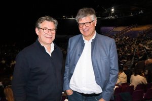 2025年12月18日,Robert Schaus(右)与朋友Gareth Konijnenberg从卢森堡专程驱车到阿姆内维尔,观看了神韵国际艺术团的演出。(张妮/大纪元)