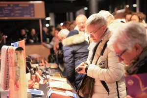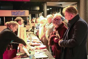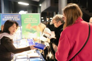 2025年12月18日,观众在阿姆内维尔大剧院(Galaxie Amnéville)内购买神韵商品和《转法轮》等书籍。(章乐/大纪元)