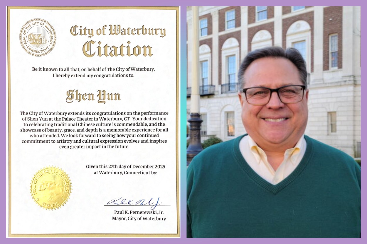 2025年12月,康州沃特伯里市(Waterbury)市長Paul K. Pernerewski, Jr.簽發「神韻藝術團褒獎令」。(大紀元合成)