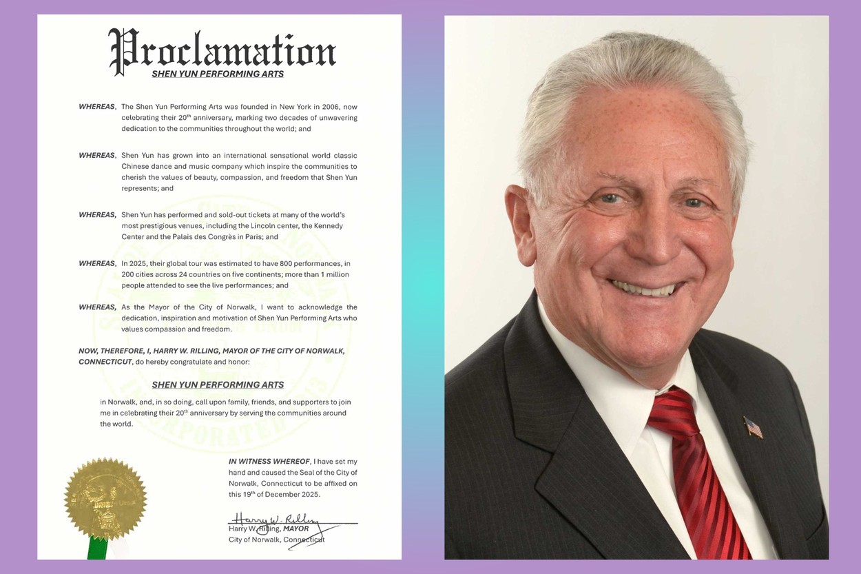 2025年12月,康州諾沃克市(Norwalk)市長Harry W Rilling簽發「神韻藝術團褒獎令」。(大紀元合成)
