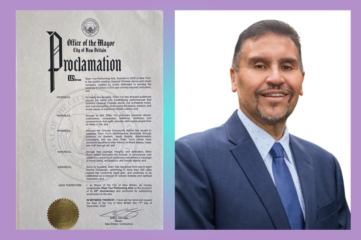 2025年12月,康州紐不列顛市(New Britain)市長Bobby Sanchez簽發「神韻藝術團褒獎令」。(大紀元合成)