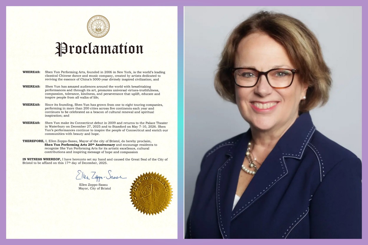 2025年12月,康州布里斯托爾市(Bristol)市長Ellen Zoppo-Sassu簽發「神韻藝術團褒獎令」。(大紀元合成)