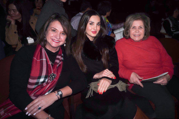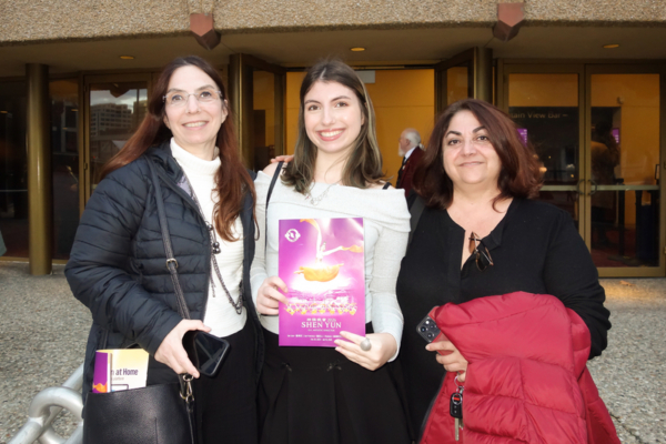 2025年12月24日,一家語言AI公司的首席財務官Ilge Karancak(右)與家人Oykum Pug(中)觀賞了神韻北美藝術團在美國加州聖荷西表演藝術中心(Center for the Performing Arts)的首場演出。(曹景哲/大紀元)