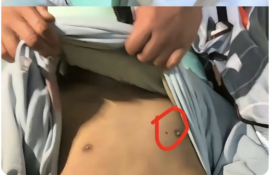 孩子左侧胸口还有个钉子般大小的孔洞。(网络截图)