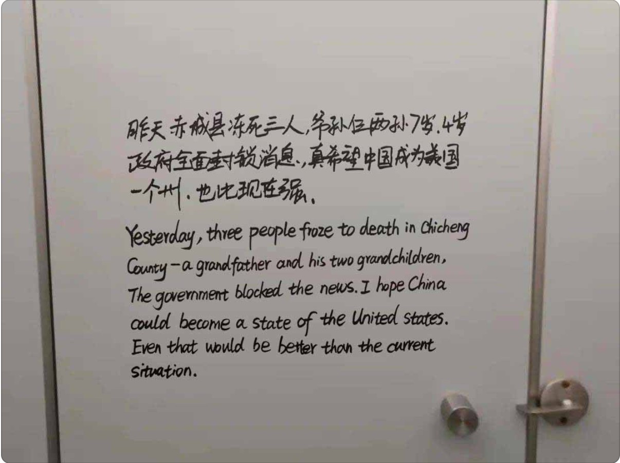 1月6日網上流傳的一張圖片中,有人用中英文在一扇門的背面寫了一段話,內容是:「昨天赤城縣凍死三人,爺孫仨,兩孫7歲、4歲,政府全面封鎖消息,真希望中國成為美國一個州,也比現在強。」 「赤城縣」隸屬於河北北部的張家口市,緊鄰著冬奧會舉辦地崇禮,當前節氣已進入三九,崇禮的最低溫已經降至零下14度到零下30度之間,赤城縣的最低溫度也應該差不多。 標語中有一句話耐人尋味:「真希望中國成為美國的一個州,也比現在強」,這說明有人已經覺醒了,只要共產黨存在一天,中國人民就過不上好日子,只有解體中共,中國人才能遠離災禍。 中共前總理李克強在2020年指出,中國至少有6億人的平均月收入為1000元左右,在中等城市連交付每月房租都困難。農村人收入更低,生活更加艱難,老人的養老金每月只有百餘元,他們吃不飽,還怎麼又多餘的錢用來燒煤氣取暖呢?只能用單薄的身體抵抗漫長的寒夜。如果這6億人因為燒不起天燃氣而看清楚了中共的邪惡,起來反抗中共,或者聲明退出中共邪惡組織,幾天功夫就可以解體中共。 (人民報首發)△