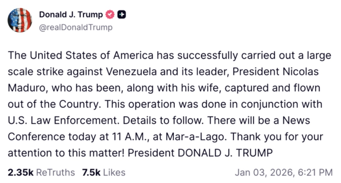 川普总统在社媒“真相社交”上发表的帖文中说:“美利坚合众国已成功对委内瑞拉及其领导人尼古拉斯・马杜罗总统发动一场大规模打击行动。马杜罗总统及其妻子已被逮捕,并被带离该国。此次行动是在与美国执法机构协同下完成的。相关细节将陆续公布。”