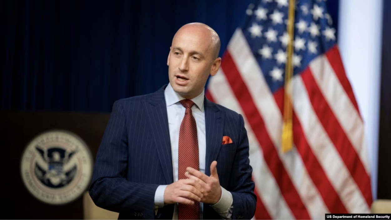 资料照片:白宫副幕僚长斯蒂芬.米勒在华盛顿特区美国移民与海关执法局总部,向来自全国各地的该局特别探员负责人及外勤行动主管发表讲话。(2025年5月20日)