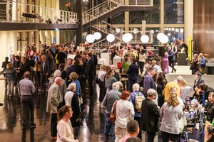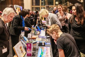 2026年2月10日下午,德国首都柏林德意志歌剧院(Deutsche Oper Berlin)大厅内,观众等待神韵演出开始,很多观众被神韵商品吸引。(张清飖/大纪元)