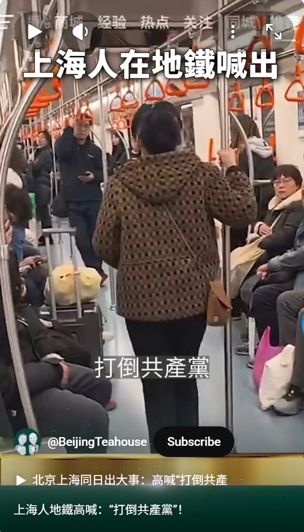 一名上海大姐在地铁上一边走一边高喊“打倒共产党!”。(视频截图)