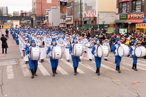 2月21日丙午馬年大年初五,法輪功學員參加紐約法拉盛大遊行,圖為第一方陣天國樂團。(戴兵/大紀元)