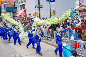 2026年2月21日丙午馬年大年初五,法輪功學員參加紐約法拉盛中國新年遊行,帶去美好和祝福。圖西人舞龍隊。(張靜怡/大紀元)