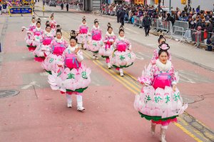 2026年2月21日丙午馬年大年初五,法輪功學員參加紐約法拉盛中國新年遊行,帶去美好和祝福。圖為蓮花舞蹈隊。(張靜怡/大紀元)