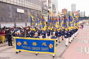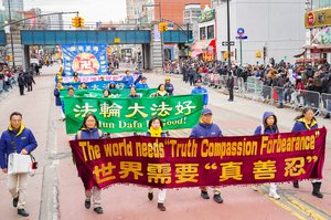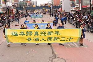 2月21日丙午馬年大年初五,法輪功學員參加了紐約市最大華人聚居地——法拉盛一年一度的中國新年大遊行活動。(戴兵/大紀元)