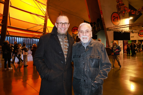 2026年2月3日下午,画家Jean-Jacques Belzane(右)和儿子Lilian Belzane观看了神韵国际艺术团在法国埃克博尔赛姆的斯特拉斯堡天顶音乐厅(Zénith de Strasbourg)的演出。(张妮/大纪元)