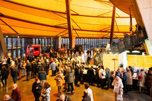 2026年2月3日下午,特拉斯堡天頂音樂廳內,觀眾們準備進場觀看神韻演出。(章樂/大紀元)