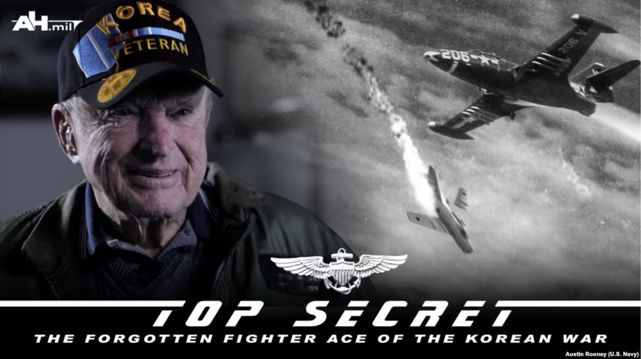 资料图片:展现退役海军上校罗伊斯.威廉姆斯在朝鲜战争期间单机击落数架米格战机壮举的视频招贴画。(2018年12月1日)