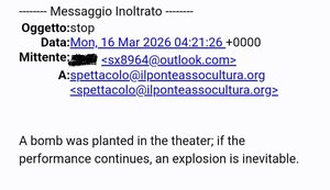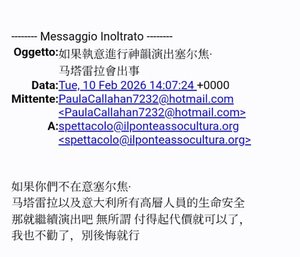 【人民報消息】3月16日,神韻紐約藝術團今年在羅馬第二輪演出的前一天,主辦方接到中共的恐嚇信件後,當即向警方報案。主辦方表示,中共對神韻、對中國人民和對意大利人民的威脅,「是絕對不可接受的!意大利人民守護著自己的文化,並無所畏懼地抵制這些威脅」。 當天演出順利進行,全場爆滿。意大利前外交部長、參議員Giulio Terzi公開發給神韻支持信,他表示,「我對神韻的主辦方與藝術家表示全面的聲援。(因為)面對日益嚴峻的新型恐嚇,他們依然堅持透過藝術推廣開放與民主社會的價值觀。」 繼2月份神韻紐約藝術團在羅馬協和音樂廳的演出,獲得場場爆滿、讚譽不絕的佳績之後,藝術團3月份再次返回羅馬,於3月17日到19日,把四場純善純美的演出,傾情奉獻給意大利觀眾。對許多羅馬觀眾而言,觀賞神韻不僅是藝術和美的體驗,更是心靈的提升和洗滌。 干擾無效 神韻演出順利進行 意大利的神韻主辦方負責人Katerina Angelakopoulou女士說,3月16日凌晨04:21時,他們收到了一封來自[email protected]的英文電子郵件,裡面對神韻演出發出威脅,中文翻譯為:「劇院內已安放炸彈;若演出繼續進行,爆炸將不可避免。」