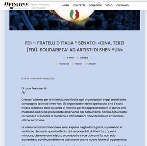 上個月,Terzi在羅馬看完神韻演出,向神韻所有參與者表達了誠摯的謝意。他說:「我衷心感謝所有藝術家、所有參與者、所有為此付出努力的人,甚至那些因無法在中國呈現這些作品而感到痛苦的人。我們期盼(神韻到中國上演)那一天早日來臨,期盼中國重獲自由。」 去年1月,他邀請神韻紐約藝術團藝術家到參議院作客,並參觀了參議院具有悠久歷史的建築。他當時提到,「他們在我國及其它西方自由國家,得到巨大的認可和鼓勵,為什麼(中共)企圖阻止、製造障礙,或擾亂呢?對此我深感遺憾。」 神韻展現了「真、善、忍」的價值觀,他說,「沒有真,沒有善、忍,沒有知情權,人們就沒有自由去理解現實,去理解歷史,去真正團結,以及相互交流。」他認為,神韻體現的價值觀,也是「歐洲國家和歐洲人民的價值基礎,這體現在歐洲條約上,以及整個歐洲歷史中」。 意大利觀眾探求法輪大法 神韻是由法輪大法修煉者創立,總部位於紐約。法輪大法是一門性命雙修的功法,其核心原則是「真、善、忍」,而神韻藝術家們都是法輪大法修煉者。從1999年開始,中共一直在迫害法輪功。據報導,法輪功學員在中國遭受酷刑、強迫勞動、虐殺,甚至被活摘器官。 神韻藝術團的宗旨是展示「共產主義之前的中國」,透過中國古典舞與音樂呈現中華傳統文化。自2006年成立以來,神韻每年都在世界各地進行巡迴演出,吸引逾百萬名觀眾到現場觀看。而中共政權對神韻演出的攻擊,也一直如影隨形。從外交施壓、虛假宣傳、匿名恐嚇信,到近年激增的炸彈、死亡威脅等事件,甚至直接威脅多國領導人的安全。 據法輪大法信息中心統計,自2006年以來,在38國記錄了數百起干擾事件,中共外交人員涉案居多。近年(2024年起)暴力威脅大幅上升,已超過140~226起,多與中共跨國鎮壓相關。這些惡行遭到多國議員、黨派的堅決反對和譴責。 神韻樂團指揮兼副總裁陳纓(Ying Chen)告訴《大紀元時報》:「為了迫使神韻取消演出,中共竟不惜威脅世界領導人的生命,這足以顯示其手段已陷入何等流氓與絕望的境地。」她說:「這也清楚表明,北京有多害怕我們在全球舞台上揭露中共的暴政。」 神韻把法輪功學員反迫害的故事搬上舞台,體現修煉者在艱難境遇中,依然堅守「真、善、忍」信仰的故事,讓許多精英人士深受震撼,引發了他們對生命真諦與修煉方法的追尋。