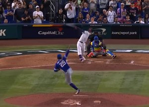 委内瑞拉棒球队赢球后,一名队员披上国旗,高举双臂,跪在地上,仰头感谢上帝。(视频截图)