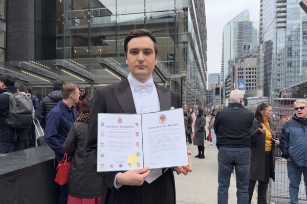 2026年3月29日下午,多倫多四季劇院(Four Seasons Centre)在神韻國際藝術團演出前收到炸彈威脅,演出被迫取消。神韻藝術團主持人Daniel在劇院外展示了一封還未來得及頒發的褒獎信函,這封褒獎是加拿大資深國會議員Judy Sgro頒發給神韻藝術團的。(滕冬育/大紀元)