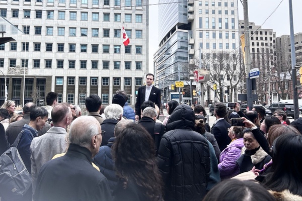2026年3月29日,多倫多四季劇院在演出前收到炸彈威脅,神韻演出被迫取消,主持人Daniel在劇院外向等候的觀眾解釋。(李佳/大紀元)