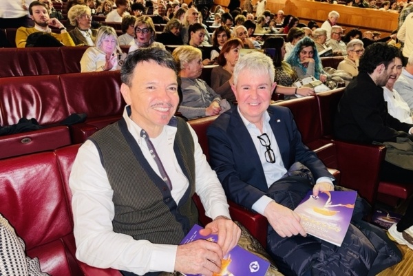 2026年3月4日晚,美國神韻紐約藝術團在西班牙畢爾巴鄂的巴斯克王宮劇院(Palacio Euskalduna)上演了今年在當地第二場演出。畢爾巴鄂市議員 Iñigo Santiago Zubizarreta Aguirrezabal(右)與朋友Ender Bracho一起觀看了演出。(王亦笑/大紀元)