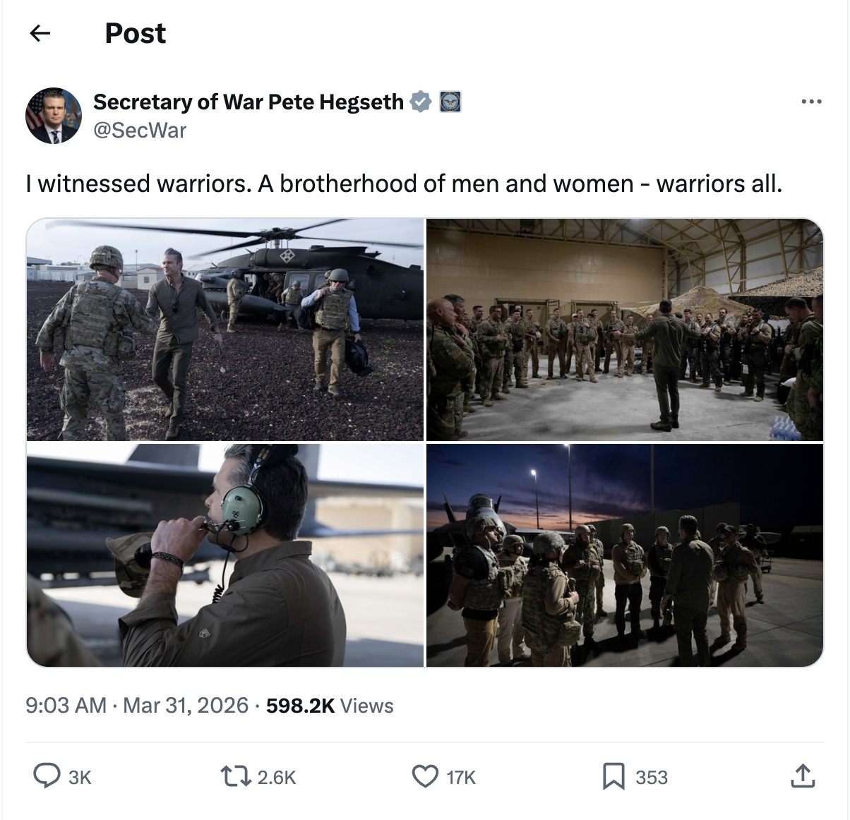 美国战争部长(国防部长)海格塞斯周二(3月31日)发布他秘密探访中东美军的照片。
