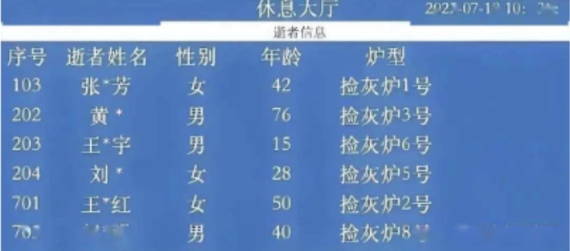 今年3月,大陆网友传出一张未注明城市的殡仪馆电子屏幕截图,显示年轻人死亡率也颇高,只有一名死者在60岁以上,其余5人都没超过50岁,最年轻的只有15岁。