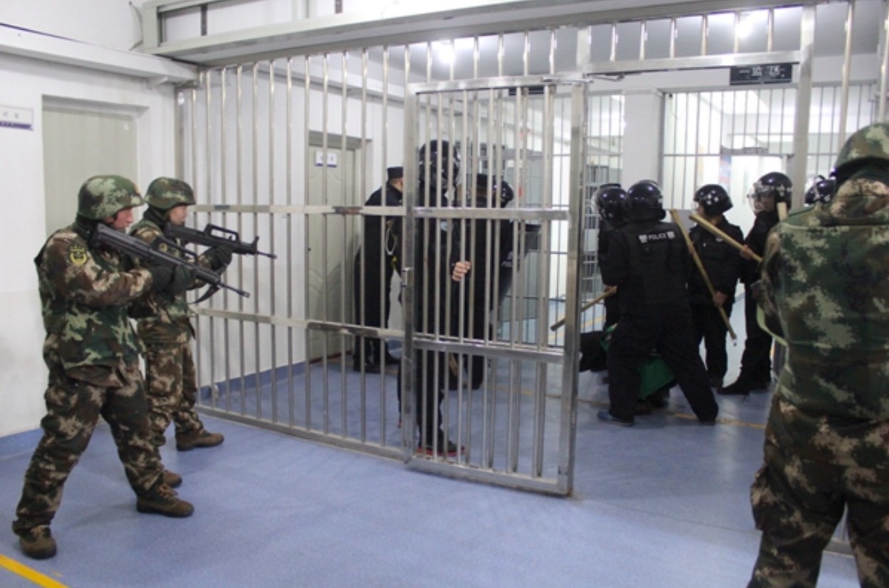 在外泄的照片中,新疆集中营的武装人员,以突击步枪指向在押人员。 (郑国恩X截图)