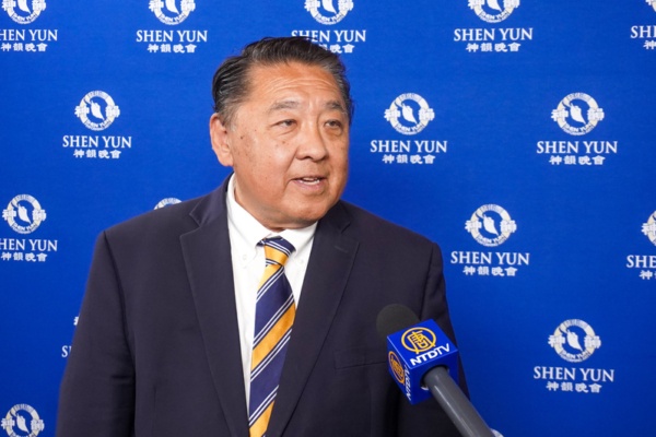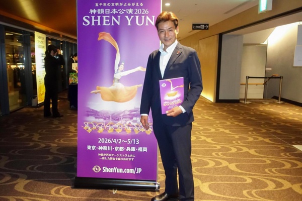 據大紀元日本京都記者站報導,「氣勢恢弘!影像背景(天幕)與舞蹈完美契合、融合成一體,把真正壯麗的中國展現得淋漓盡致,實在太精彩了!」東京江東區議會議員二瓶文隆(Nihei Fumitaka)觀看演出後讚歎道。