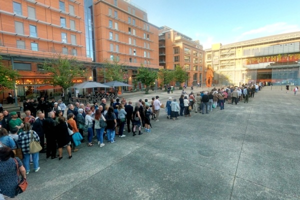 2026年4月6日晚,神韻世界藝術團在法國里昂國際城圓形劇場(L\’Amphithéâtre 3000)首場演出爆滿。圖為觀眾排隊進場。(傅潔/大紀元)